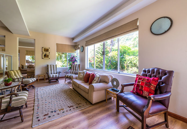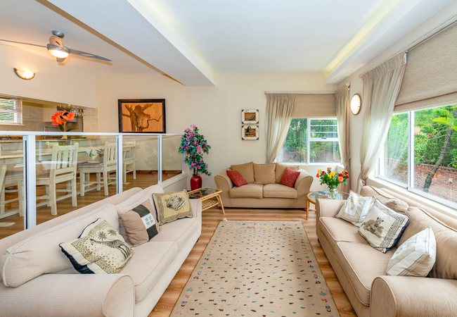 The lounge is on a split level open to the dining room and has doors leading to an outside deck (ideal for breakfasts) and a TV Room (TV has all DStv stations). A large sliding window looks out onto a sunny garden which has a lapa type braai / barbecue facility under the Milkwood trees.