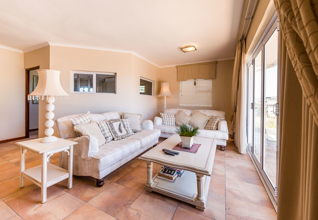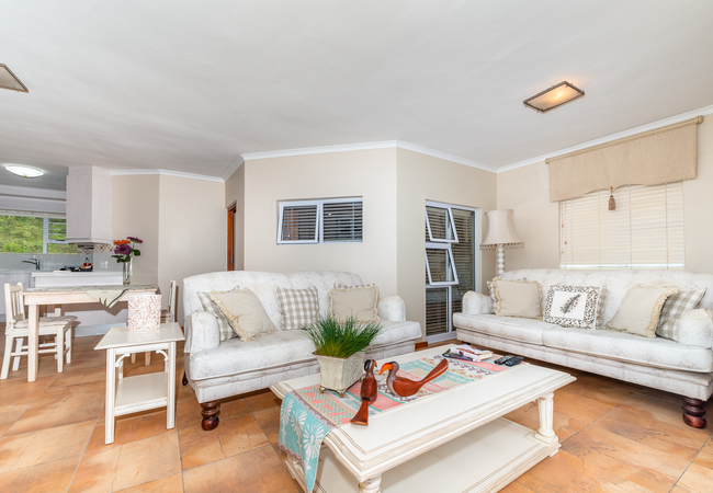 This Villa comprises two bedrooms of which one is en-suite. The other bathroom is separate. There are two beds in an open area which can accommodate an extra two adults or children, however, this is not a bedroom. The first bedroom is furnished with a Queen-size bed and the second bedroom is furnished with a double bed. There is an exceptional kitchen with ample fridge/freezer space and a double oven and gas hob. Lounge and dining area. It has a modern kitchen with serving hatch to a large family dining table which steps down to a lounge looking out onto the sunny garden. The deck leads out from the lounge and there is a separate TV room with a large HD TV with all DStv channels. Use of laundry equipment is available.