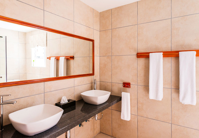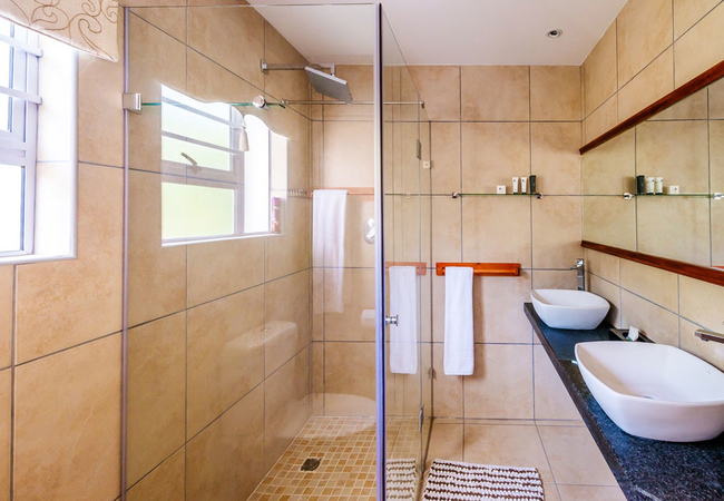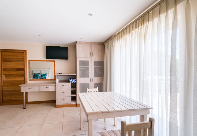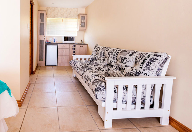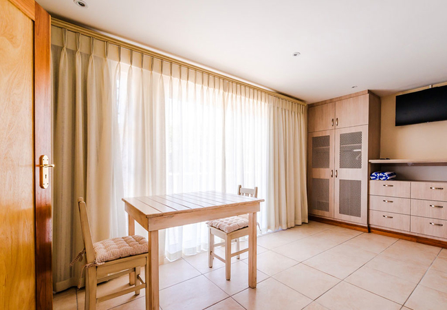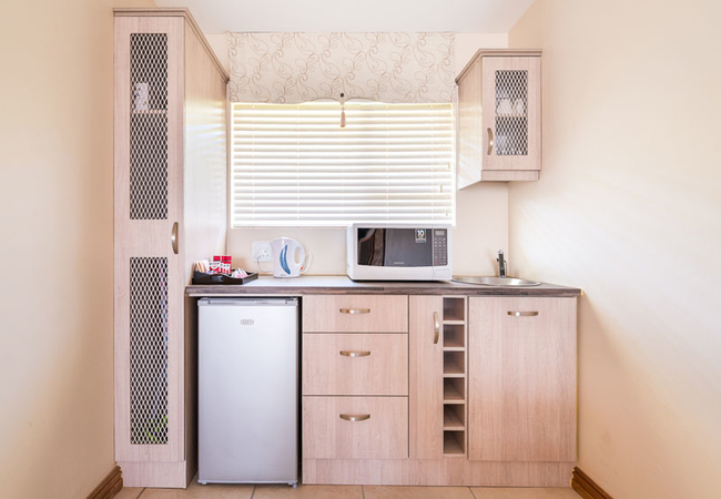 This room comprises a compact coffee station with microwave for heating food, small fridge, kettle, toaster and cutlery needed. Queen size bed, en suite bathroom, TV with full DSTV and Wi-Fi. This room is not self catering.