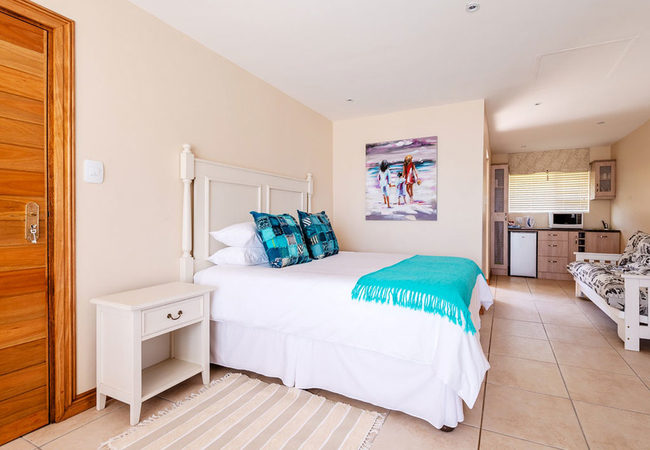 The East Wing is a spacious room with en-suite bathroom. It is furnished with a double bed and the en-suite bathroom is equipped with a shower, hand basins and WC. There is an HD TV with all DStv channels and the bedroom leads out onto a balcony overlooking the ocean. This newly built room on the second storey has TV, Air-conditioning, bar fridge and is very light and roomy with views of the sea. Well designed cupboards and vanities. Plugs for charging with USB plugs.