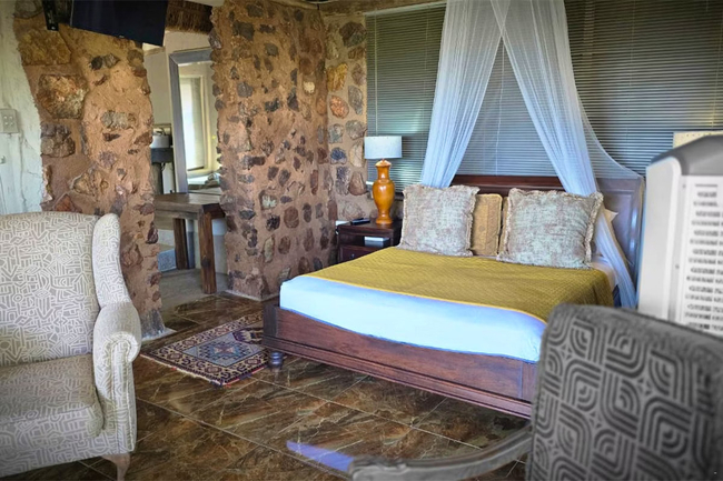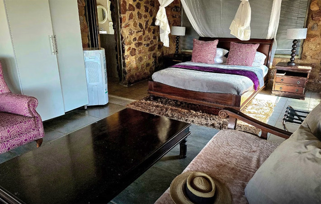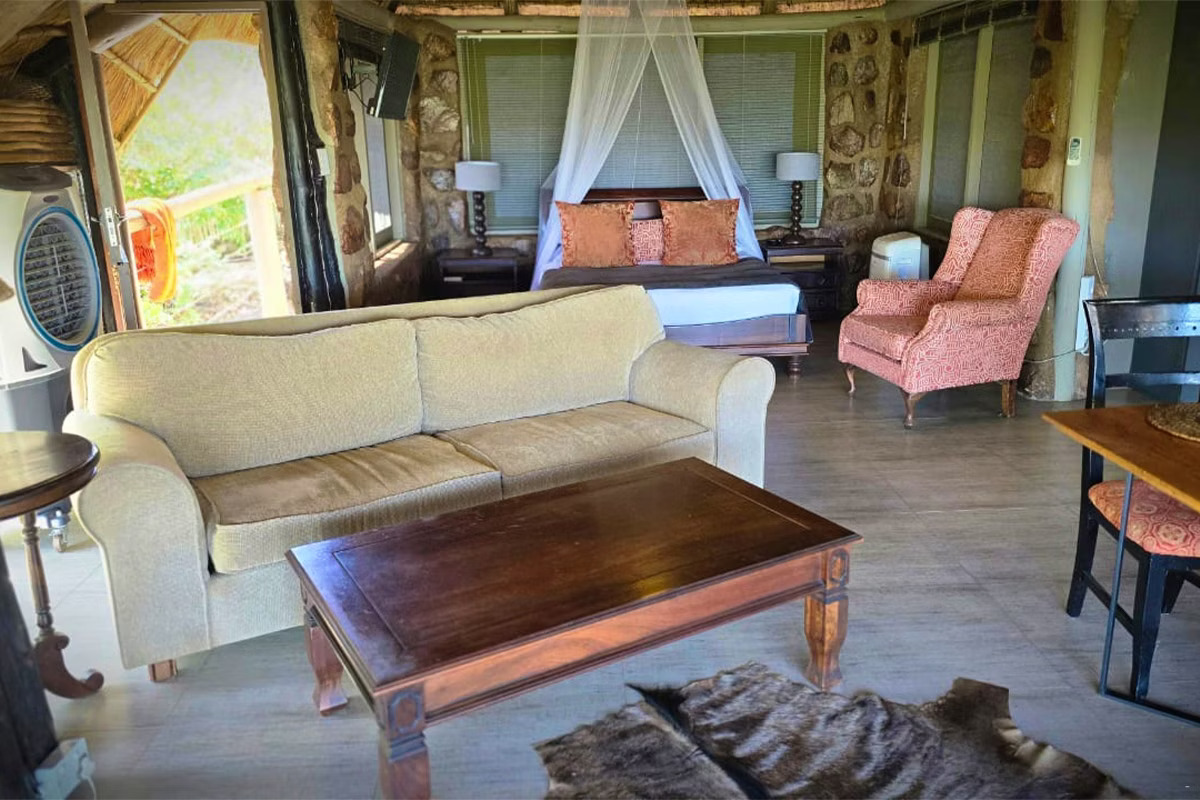 African Bush Chalets are very popular for its privacy and suitable for business travellers. The unit is furnished with a King-size be3d or twin beds and includes a bath and inside shower, a kitchenette with a fridge, microwave, kettle and hot plate. It also comes with a small patio and weber braai.