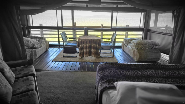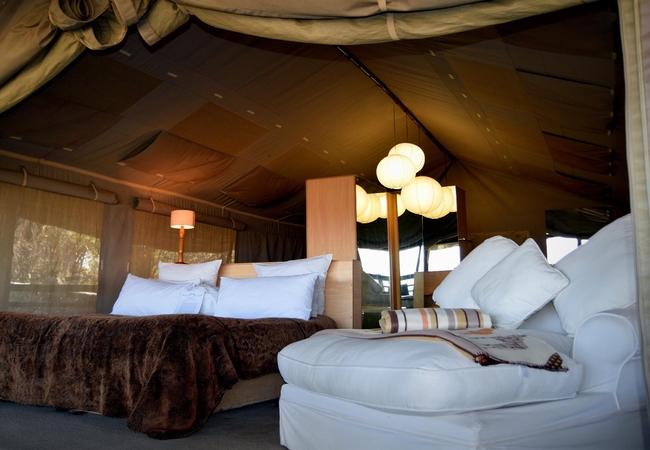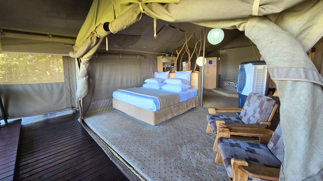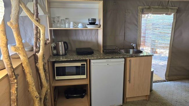 Each tented unit is furnished with a king-size bed, and features an open-plan bathroom fitted with a shower. Each unit has a kitchenette with heat-and-eat facilities such as a bar fridge and a microwave. There is also a portable braai for guests to use.