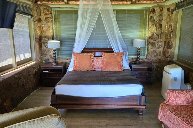 Our African Bush Chalet is a two bedroom with twin single beds, perfect for couples or friends to share. The unit has two bathrooms with shower, a kitchenette and spacious lounge. The unit comes with a private boma area with double braai facilities, large open splash pool and exterior mini-kitchen.