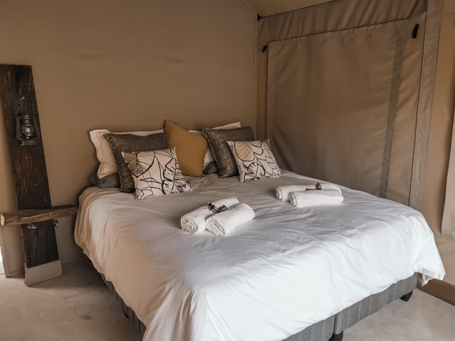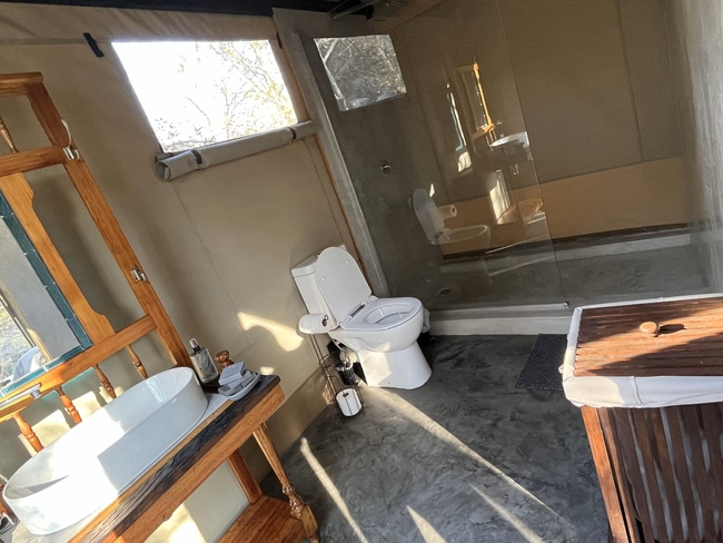 The Safari Luxe Tent offers a luxurious and flexible accommodation option, featuring a king-size bed that can be converted into twin beds. It includes an en-suite bathroom equipped with a shower, toilet, and wash basin. Guests can enjoy stunning views of the garden, mountains, and river from the private patio, which is furnished with outdoor furniture and a dining table for two. Additional amenities include Wi-Fi, a heater, bathroom essentials, and daily cleaning service, ensuring a comfortable and memorable stay immersed in nature.