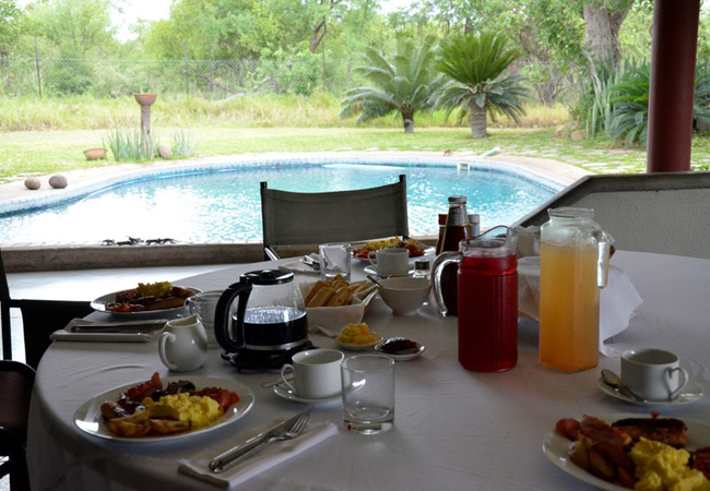 Breakfast at Tingala is served on the shady patio and dinners are enjoyed around a log fire under the stars. Guests can enjoy a picnic lunch in the bush on the full day game drive, and sun downer drinks are served on afternoon game drives.