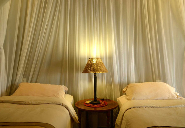 The Twin Room is furnished with two single beds and has a veranda with seating area. The en-suite bathroom is equipped with a bath and shower. The suite is decorated in earthy tones and opens onto a patio that overlooks the bush and is equipped with air-conditioning, tea and coffee making facilities and the beds are draped in mosquito nets. Free Wi-Fi is available at the lodge.