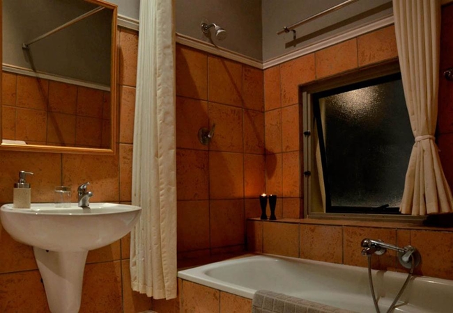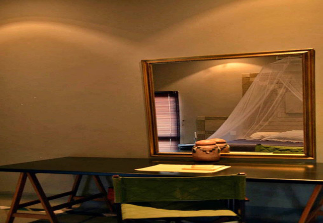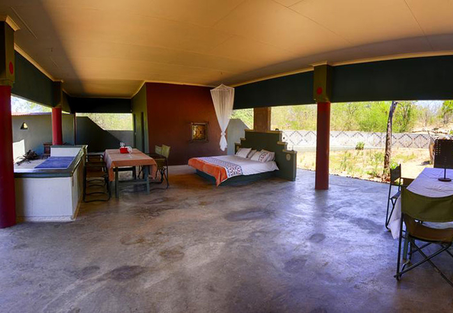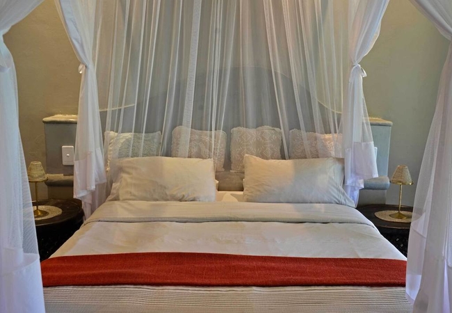 The Double Room is furnished with one King-size bed and has a veranda with seating area. The en-suite bathroom is equipped with a bath and shower. The suite is decorated in earthy tones and opens onto a patio that overlooks the bush and is equipped with air-conditioning, tea and coffee making facilities and the beds are draped in mosquito nets. Free Wi-Fi is available at the lodge.