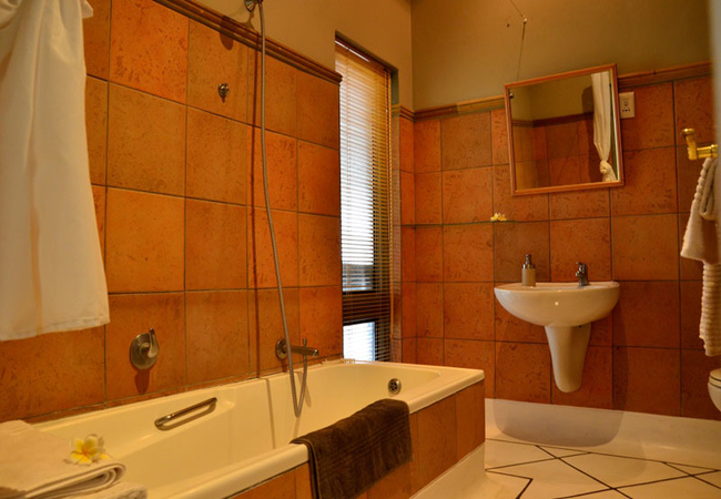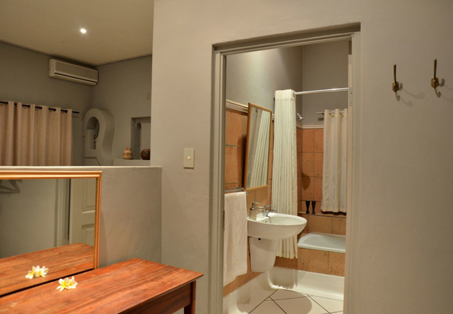The Double Room is furnished with one King-size bed and has a veranda with seating area. The en-suite bathroom is equipped with a bath and shower. The suite is decorated in earthy tones and opens onto a patio that overlooks the bush and is equipped with air-conditioning, tea and coffee making facilities and the beds are draped in mosquito nets. Free Wi-Fi is available at the lodge. Garden and bush views.
