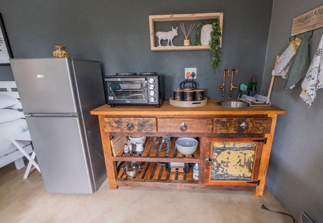 The cottage has a kitchenette with a microwave, kettle, large fridge and two-plate mini stove and oven. Private braai facilities are available or guests can make use of the shared facilities.