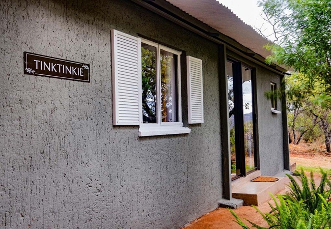 Tinktinkie is open plan and furnished with a Queen-size bed and bunk beds. The bathroom is fitted with a shower, toilet and basin. The cottage has a kitchenette with a microwave, kettle, large fridge and 2-plate mini stove and oven. Private braai facilities are available or guests can make use of the shared facilities.