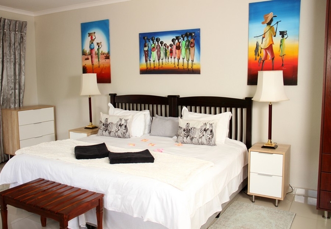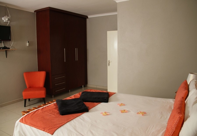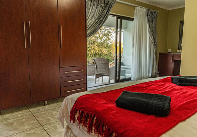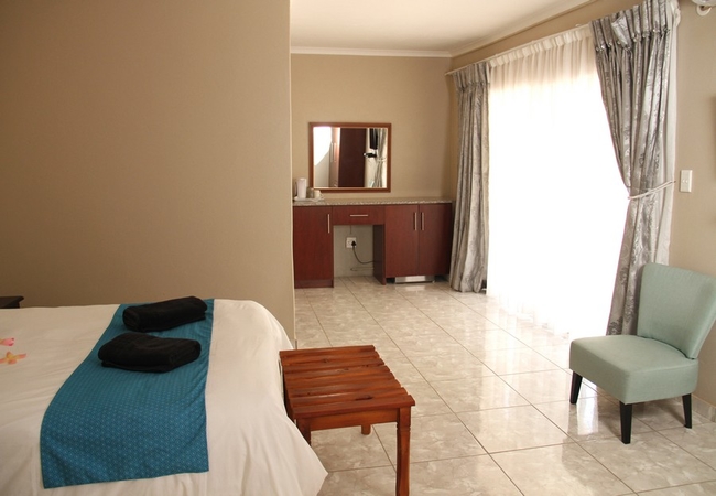 Luxurious and spacious room furnished with a Queen-size bed. The en-suite bathroom is equipped with hand basin, WC and shower. Other facilities include a balcony, air-conditioning, fridge, TV, coffee station. Each room has a TV with DStv, a private balcony, a bar fridge and tea / coffee making facilities.