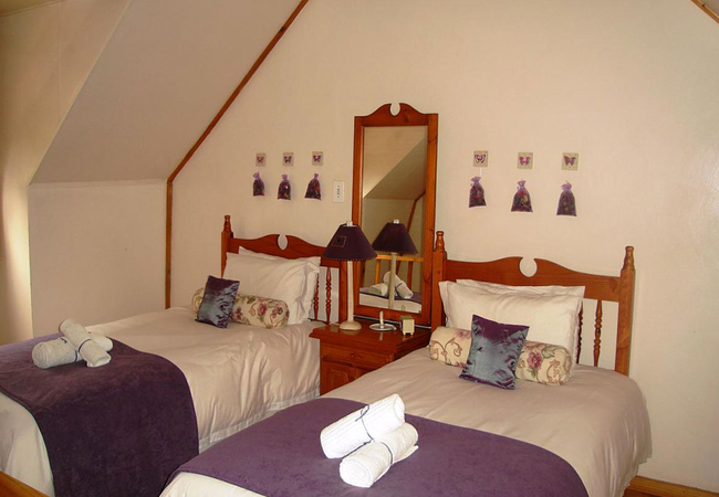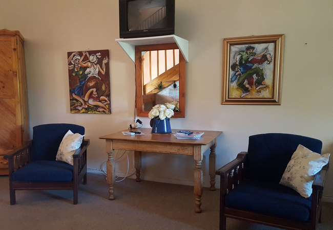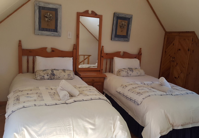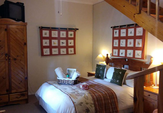 The Stalls comprise a double bed, an en-suite bathroom with a shower, and a kitchenette. The double bed, en-suite bathroom and kitchenette are located downstairs, and have access to an outdoor patio and are equipped with a TV with selected DStv channels. The kitchenette is equipped with a bar fridge, microwave, 2-plate electric burner, tea and coffee tray, kettle and toaster, and some cutlery. Upstairs is comprised of 2 single beds, or 3 single beds