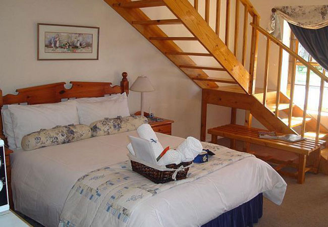 This is the only first floor room accessed by a flight of stairs onto a small wooden deck. The room is furnished with a double bed and has an open plan bathroom with bath and hand shower. The unit is air-conditioned. The suite has access to an outdoor patio and is equipped with a TV with selected DStv channels, a bar fridge, microwave, tea / coffee making facilities and a toaster.