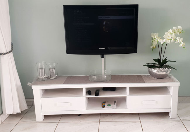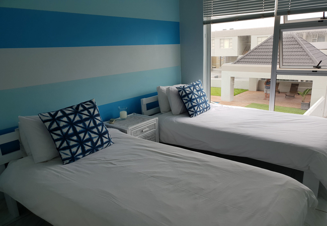 The lounge has a large flat screen TV with full DStv and leads onto a private balcony overlooking the pool. There is a gas braai and outdoor furniture, with sea views. No braai fires are allowed.