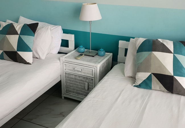 The main bedroom has a Queen-size bed and en-suite bathroom with a shower, basin and toilet. The second and third bedrooms have two single beds which can be converted to King-size beds and a celing fan. These bedrooms share a bathroom with a bath, shower, basin and toilet.