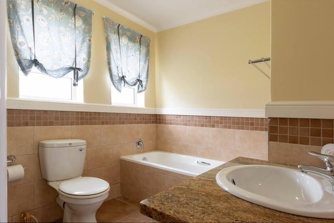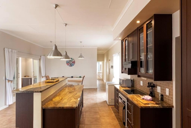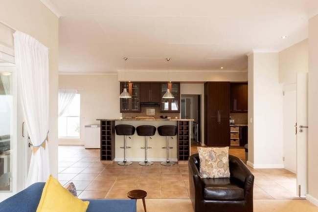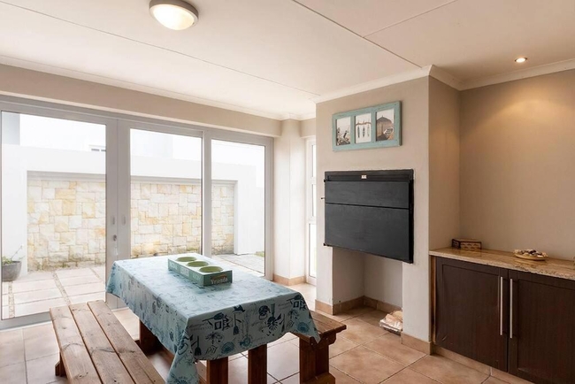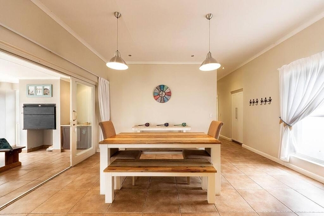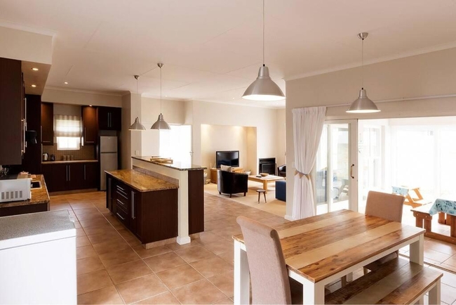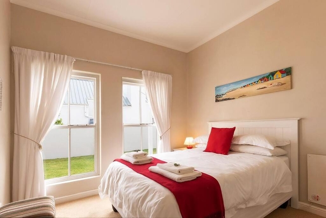 This charming open-plan cottage can host up to six guests in three well-appointed bedrooms with two full bathrooms. The master bedroom boasts a queen-size bed and an en-suite bathroom, equipped with a bath, shower, toilet, and dual washbasins. Each of the remaining bedrooms contains a double bed. The second bathroom includes a bath, shower, toilet, and washbasin. Linens and bath towels are provided, though guests are asked to bring their own beach towels. The fully-equipped kitchen offers a stove, oven, microwave, toaster, fridge-freezer, chest freezer, tea and coffee-making facilities, cutlery, and crockery. A breakfast bar with three stools complements the kitchen setup. In the adjacent scullery, guests will find a dishwasher, washing machine, and tumble dryer. The dining area features a table accommodating six guests, while the lounge area is furnished with a comfortable suite and a TV with DStv. Complimentary, unlimited Wi-Fi is also available. A sliding door leads to a covered patio, which includes a picnic table and a built-in braai, perfect for outdoor dining. The cottage is conveniently situated directly opposite a children's play park, and guests have access to secure parking in a garage.