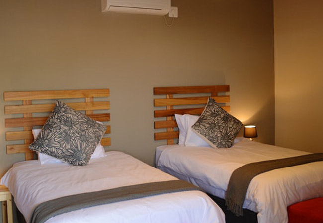 This Twin room is furnished with two three-quarter beds. All the en-suite rooms have full air-conditioning, heating, USB charging points, large showers, tea and coffee making facilities and private stoeps / patios. There is off street parking and free Wi-Fi is available.