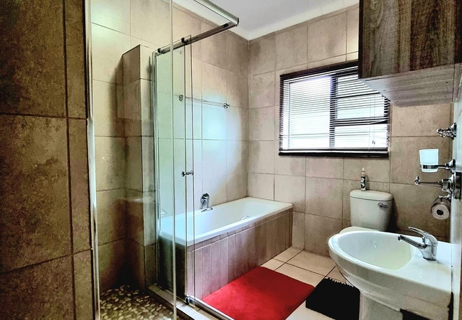Treasure House is air-conditioned and has three bedrooms and two bathrooms. The first bedroom is furnished with a Queen-size bed and has an en-suite bathroom fitted with a bath, shower, toilet and basin. The second bedroom has a Queen-size bed and the third bedroom has two single beds. The shared bathroom is fitted with a bath, shower, toilet and basin. The kitchen is fully equipped for self catering and includes a gas hob which is convenient for loadshedding and a dishwasher. There is also a breakfast bar with stools. The dining room can seat six guests and there is a cosy lounge. Sliding doors lead out to the furnished patio, braai area and swimming pool.