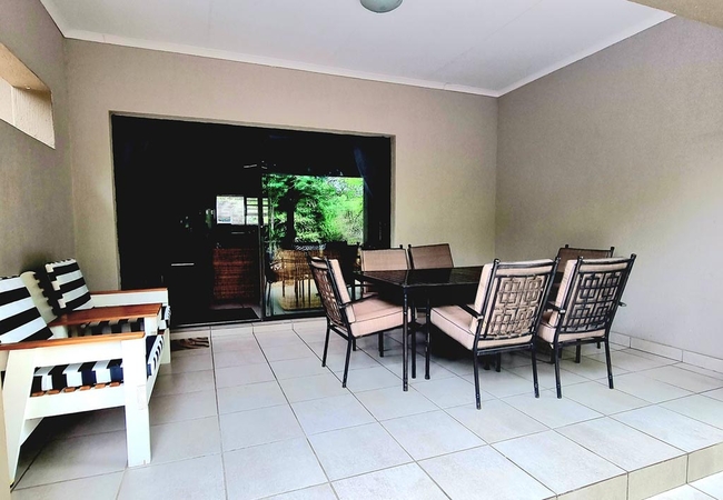 Sliding doors lead out to the furnished patio, braai area and swimming pool.