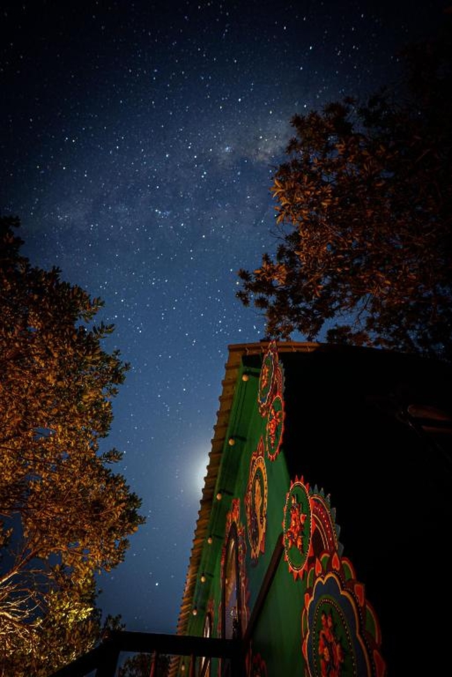 The jewel tone colour palette designed for playfulness and to lift your mood to one of happiness and joy. The Gypsy interior takes the lead from the moon and stars typical to Gypsy heritage. The entrance to the bedroom invites you in with its kissing moons getting you in the mood to cuddle. With natural boho chic vibes and soft luxurious white 100% cotton on the queen bed will ensure you have the best night sleep. A cozy comfy throw and a unique feature headboard and plenty of storage under the bed for luggage makes this the perfect space. The bathroom is light and bright, with cool playful tiling, a rain shower and a window with a forest view. Open shelving in the kitchen, with cast iron cookware and high quality utensils invite you to indulge your inner chef. Grab fresh herbs from our communal garden and listen to the birds while you cook. The private outside garden is enclosed and extends your living area. Enjoy the private fire pit / braai area and hangout on The Moon Swing and four-poster daybed for magical photo moments. Lounging and dining are in your own private greenhouse, all lit up by ambient fairy lights. Enjoy the beautifully crafted space, designed especially for you. Mark your magic moment with a unique comment or quote on our beautifully crafted guestbook on the Vardo exterior.