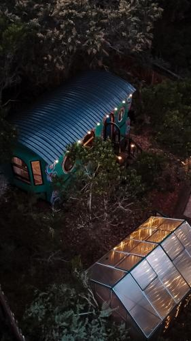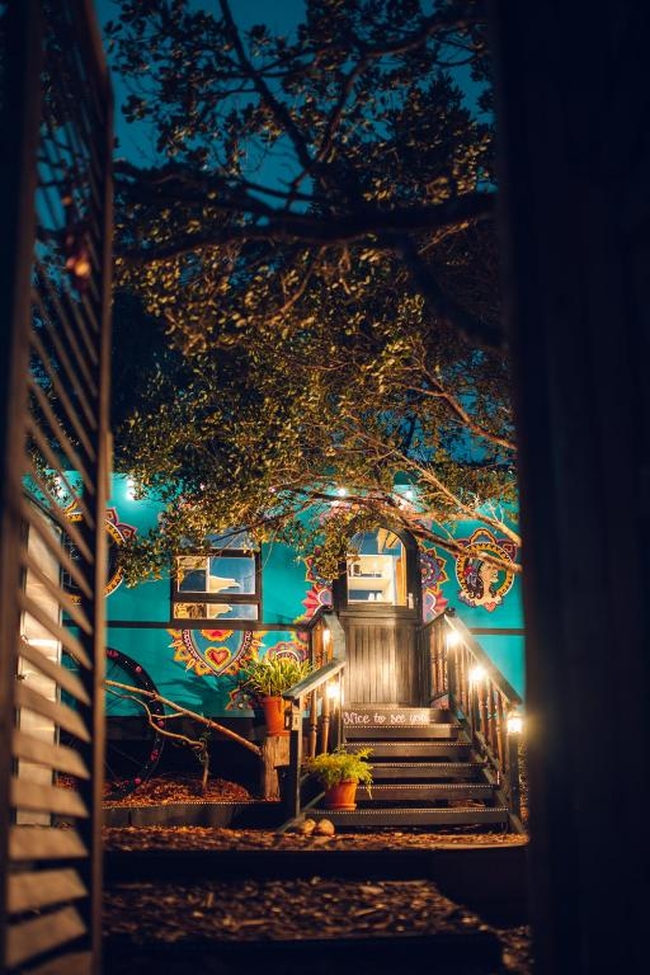 Take in the beautiful artwork designed to evoke calmness and encourage the sacred unity of love you share. The Owl's bedroom has its own specially designed entrance to make your snuggling experience magical. With natural boho chic vibes and soft luxurious white 100% cotton on the queen bed will ensure you have the best night sleep. A cozy comfy throw and a unique feature headboard and plenty of storage under the bed for luggage makes this the perfect space. The bathroom is light and bright, with cool playful tiling, a rain shower and a window with a forest view. Open shelving in the kitchen, with cast iron cookware and high quality utensils invite you to indulge your inner chef. Grab fresh herbs from our communal garden and listen to the birds while you cook. The private outside garden is enclosed and extends your living area; with a large rocking day bed for those lazy days or star filled nights around the fire pit / braai. Lounging and dining are in your own private greenhouse, all lit up by ambient fairy lights. Enjoy the beautifully crafted space, designed especially for you. Mark your magic moment with a unique comment or quote on our beautifully crafted guestbook on the Vardo exterior.