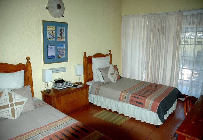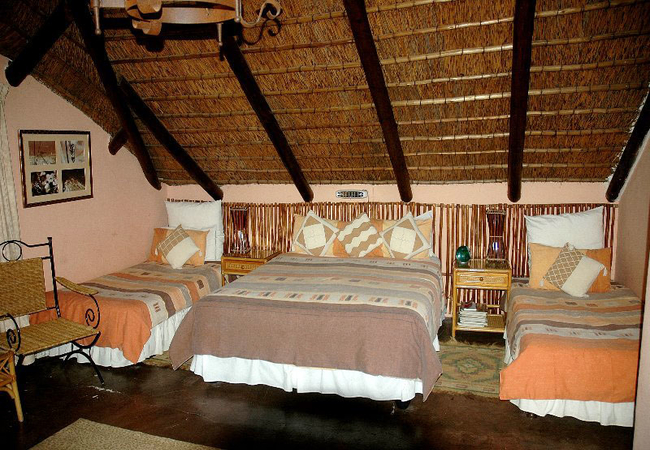 This Family Unit has 3 separate beds. Open plan upstairs room with a Queen-size bed and two single beds, all in the same room. Has en-suite shower, mini bar, air-conditioned and has a TV with DSTV. Best suited to 2 adults and 2 kids.