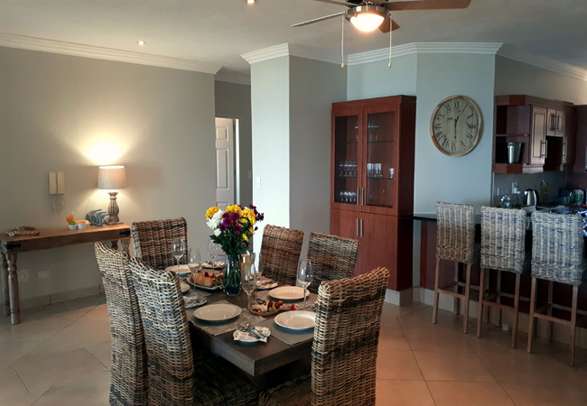 Trevi 11 is a first-floor apartment and has three bedrooms, two bathrooms and is able to accommodate 6 guests. The main bedroom is furnished with a Queen-size bed and has a full en-suite bathroom fitted with a bath, shower, toilet and basin. The second bedroom is furnished a double bed. The third bedroom is furnished with two single beds. The second bathroom is fitted with a shower, bath, toilet and basin. Ceiling fans are available in each bedroom and in the lounge. Guests need to bring their own towels. Bed linen is provided. The apartment a kitchen, lounge and dining area. The kitchen is fully equipped for self-catering and contains a stove, oven, fridge-freezer, microwave, cutlery and crockery. There is also a breakfast bar with stools. A dishwasher, a washing machine and a tumble-dryer are available for your convenience. The dining area has seating space for six guests, while the lounge has a comfy couch and a TV with a full selection of DStv channels. The apartment boasts a patio with outdoor dining space for six and is equipped with a gas braai and has sea facing views.