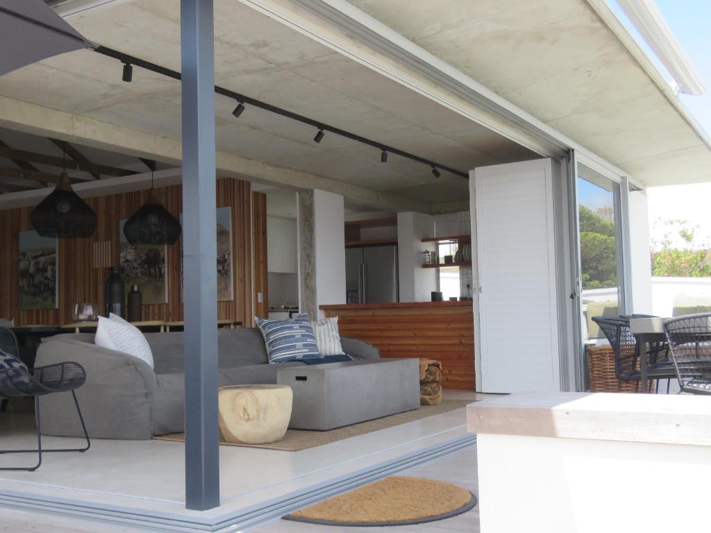 The self catering cottage has two en-suite bedrooms, both of which are air conditioned. The rooms lead via sliding doors to an outside area. The rooms are equipped with a hairdryer, linen, bath towels and beach towels. A camping cot is provided. The lounge is comfortably furnished with a couch and chairs as well as a sack couch that forms part of the patio seating. There is a TV with DStv and free Wi-Fi. Sliding doors lead out to the wrap-around patio which is furnished with a dining table, sun loungers and an umbrella. The kitchen has beautiful sea views and is fully equipped with a stove, an oven, fridge / freezer, microwave, dishwasher, crockery and cutlery as well as pots, pans and a toaster. There is also a washing machine, tumble dryer and built-in braai facilities.