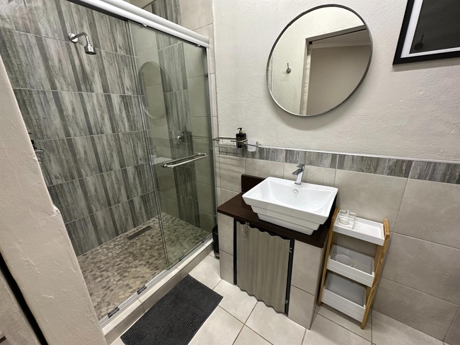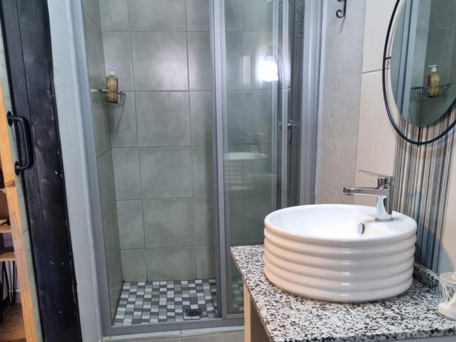 This spacious unit features an en-suite bedroom furnished with a comfortable double bed and a private bathroom complete with a shower. Guests can enjoy access to shared facilities, including a small pool, a braai (barbecue) area, and a kitchenette equipped with a microwave and a TV. These amenities are shared with Rooms 9A, 9B, and 9C, creating a relaxed and communal atmosphere perfect for unwinding.