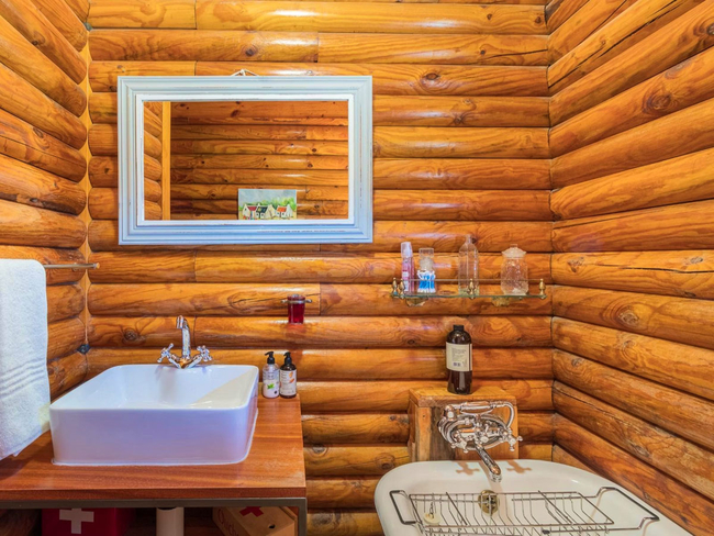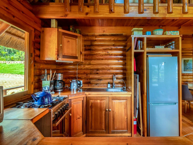 The living and dining areas are comfortably furnished, offering a welcoming space to relax and enjoy meals. For entertainment, the cabin includes a television, while a fireplace and air-conditioning ensure year-round comfort. Complimentary Wi-Fi access is also available for guests.