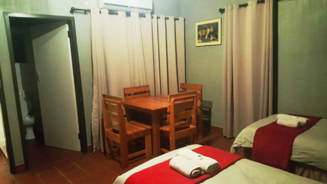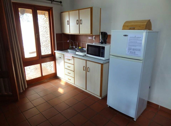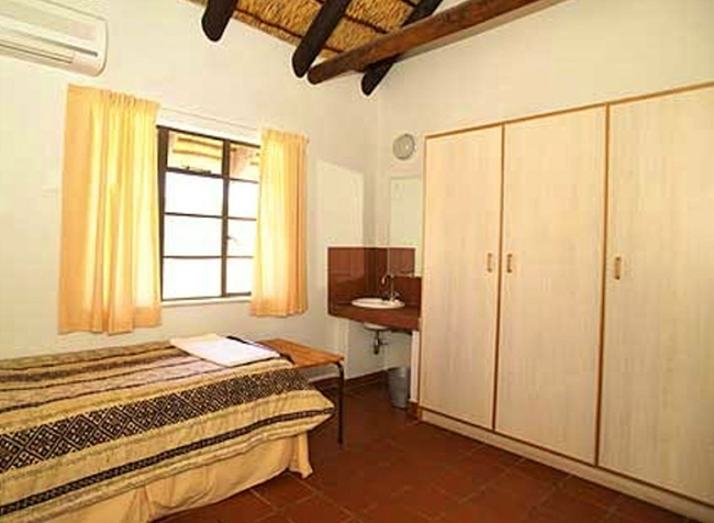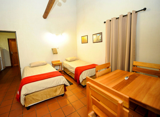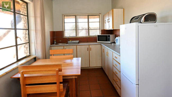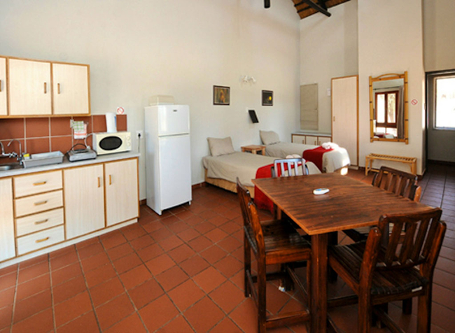 These family cottages have an open-plan layout. The bedroom area is furnished with three single beds, and a bathroom fitted with a shower, a toilet, and washbasin. The cottages are air-conditioned. The kitchen is well-equipped for self-catering with a fridge-freezer, 2-plate hot-plate, a microwave, kettle, toaster, and cutlery and crockery. There is a 4-seater dining table and chairs. Each cottage has a patio with braai facilities.