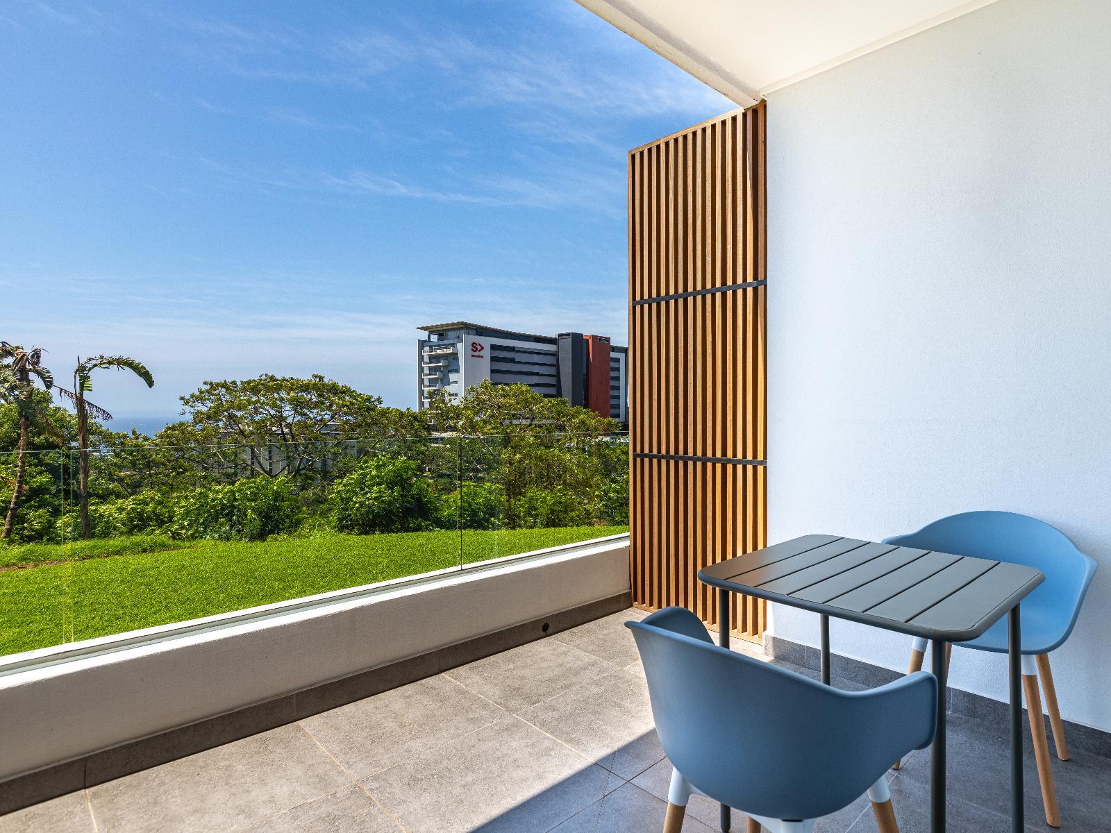 The lounge area offers comfortable seating, a TV with Netflix, and Wi-Fi access. Step out onto a private balcony with an outdoor lounge area, perfect for enjoying the tranquil surroundings and scenic ocean views.