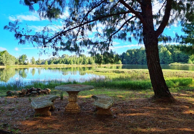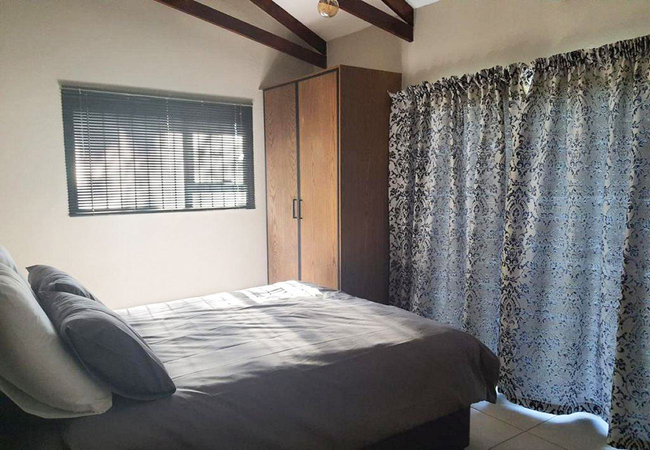 This chalet has two bedrooms furnished with Queen-size beds. The bathroom is fitted with a shower, toilet and basin. The kitchenette has a gas stove, fridge and geyser. Basic kitchenware is included. There is a lounge with a fireplace, seating area, table and chairs. Outside each chalet is a private braai facility and a patio looking out onto the bass fishing dam and pine trees.