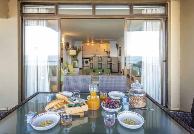 The kitchen is equipped for self-catering with a fridge-freezer, oven and stove, microwave, and coffee machine, as well as a washing machine, tumble dryer and dishwasher. The spacious open-plan dining room and lounge has a Smart TV with Netflix. The lounge is sea-facing and has direct access to the balcony.