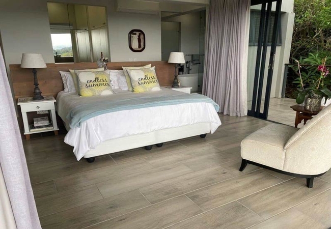 Umvumvu 29 is a self-catering holiday home in Ballito sleeping eight guests. The main bedroom furnished with a King-size bed, walk-in dressing room and full en-suite bathroom offers superb views over the estate and natural tree line. There are an additional three spacious bedrooms all furnished with Queen-size beds and an en-suite bathroom fitted with a shower, toilet and basin. There is also a PJ lounge area for children's gaming - will keep the children busy long after you have gone to bed! An indoor games room and cinema lounge ensure that the kids and family are kept entertained while enjoying a draught beer on tap with friends. (tap included, keg to be arranged). Office area can be used for work from home parents that need to bring their work along with them. The house exudes character throughout the open plan living area which includes a modern kitchen, dining room, formal lounge with stack doors onto the exquisite outdoor entertainment area and private, rim flow pool. A built-in bar area as well as a firepit and seating area finish the outdoor garden off perfectly.