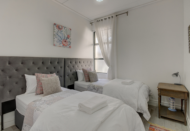 Paardevlei Square 3 Bed holiday apartment has three bedrooms. The first bedroom is furnished with two single beds and has an en-suite bathroom. The second bedroom has a Queen-size bed and the third bedroom has a double bed.