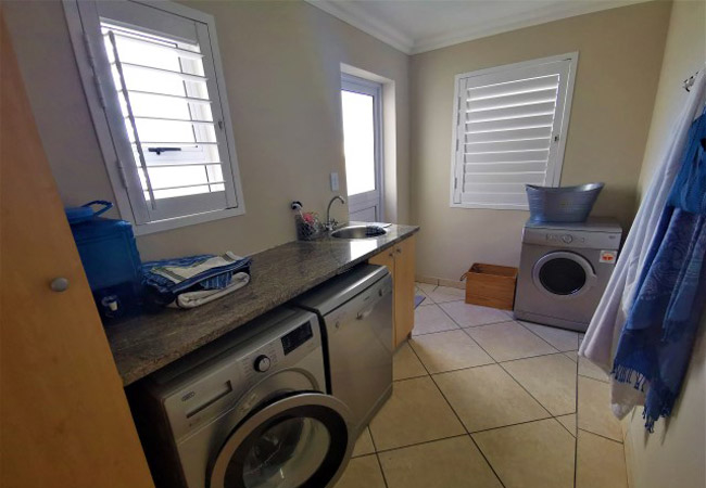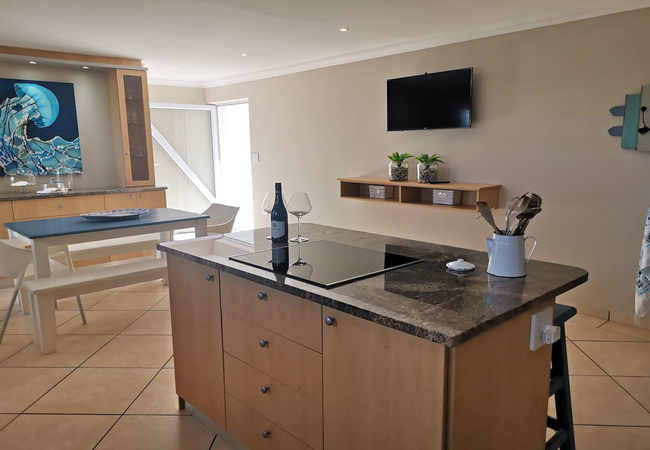 Unwind @ 167 Golden Mile is a self catering holiday home sleeping up to six guests in total. Downstairs there are two bedrooms with a double bed in each and a children's room with three single beds. The main bathroom and the separate bathroom both have a shower, toilet and basin. There is an open-plan kitchen, dining area with a TV and a scullery with a washing machine and a tumble dryer. The kitchen features a breakfast bar, and is equipped with a fridge, an oven and stove, and a microwave. Upstairs is a spacious living room with a TV, the main bedroom with a double bed and an en-suite bathroom with a shower, toilet and basin and a guest toilet. There is an enclosed braai area on the verandah, with built-in braai facilities and a portable braai. Linen and bath towels are provided. Wi-Fi is also available.