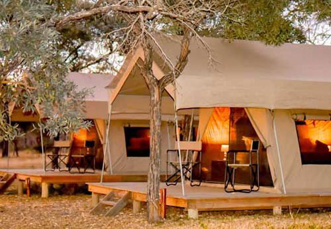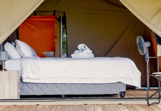 The Luxury Twin Tents are furnished with twin beds that can be converted to King-size beds on request. The en-suite bathroom is fitted with a shower, toilet and basin. The room has a fan, tea / coffee and a patio with outdoor chairs. Breakfast and dinner are included in the rates.
