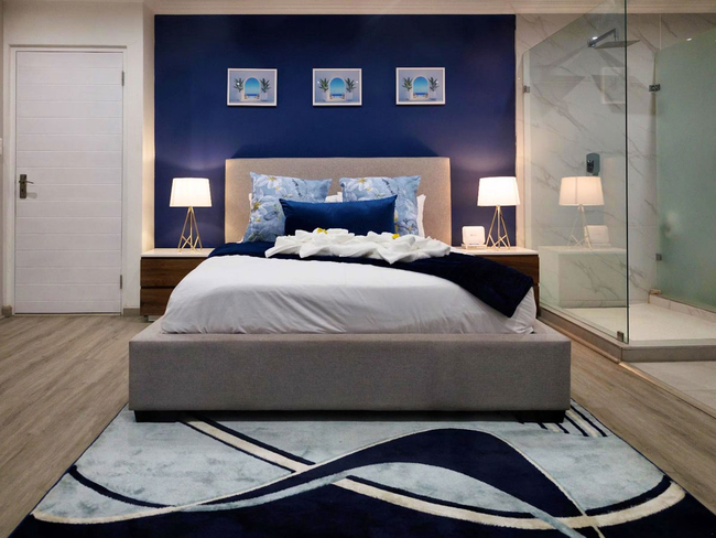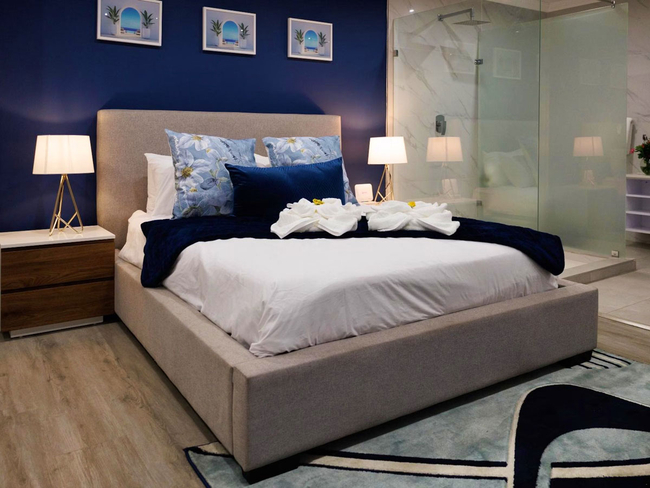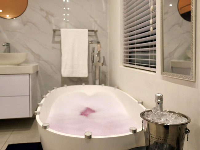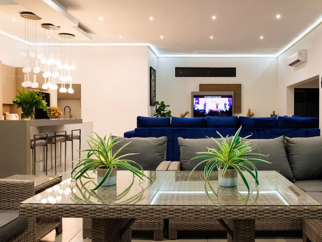 Designed to host up to eight guests, the air-conditioned home features four bedrooms and two bathrooms. Each bedroom is thoughtfully furnished with a double bed, ensuring restful nights. The main bedroom boasts an en-suite bathroom equipped with both a bath and a shower, while the other three bedrooms share a second bathroom, also featuring a bath and a shower. Guests are provided with fresh linen and bath towels for added convenience.