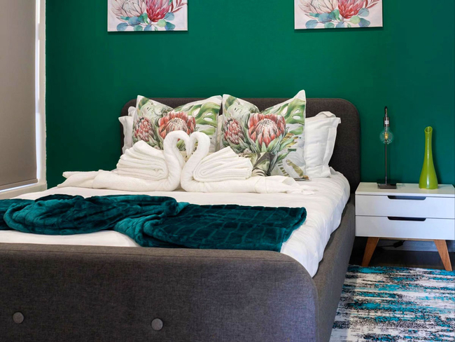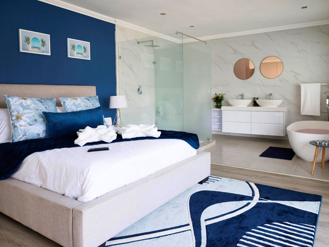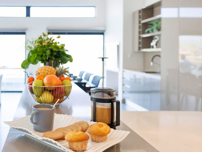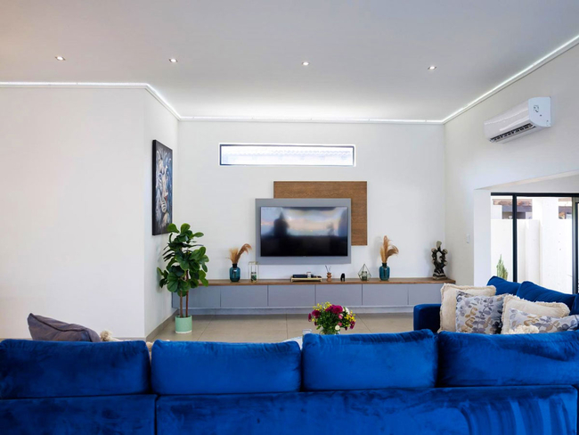 Designed to host up to eight guests, the air-conditioned home features four bedrooms and two bathrooms. Each bedroom is thoughtfully furnished with a double bed, ensuring restful nights. The main bedroom boasts an en-suite bathroom equipped with both a bath and a shower, while the other three bedrooms share a second bathroom, also featuring a bath and a shower. Guests are provided with fresh linen and bath towels for added convenience. The fully equipped kitchen is a haven for culinary enthusiasts, offering appliances such as a stove, oven, microwave, toaster, fridge-freezer, and tea- and coffee-making facilities. A breakfast bar with stools adds a casual dining option, while a separate scullery is fitted with a dishwasher, washing machine, and tumble dryer for ease during your stay. The open-plan lounge and dining area provide a welcoming space for relaxation and meals, complemented by comfortable seating and an indoor braai. Entertainment is ensured with a smart TV featuring DStv channels and complimentary Wi-Fi access. The living area flows seamlessly onto an expansive deck, complete with outdoor seating, a swimming pool, and sun loungers. Secure parking is also available for peace of mind.