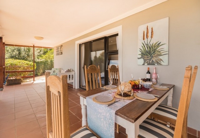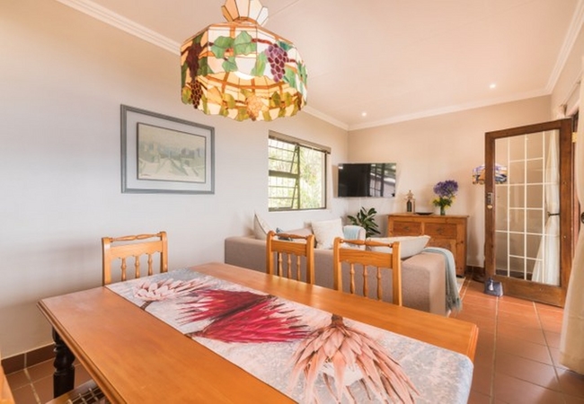 The lounge is equipped with a comfortable L-shape couch, large wall-mounted flatscreen Smart TV with Dstv app and has a door leading onto the undercover balcony. The indoor dining area is open-plan with the lounge and has a six seater table.