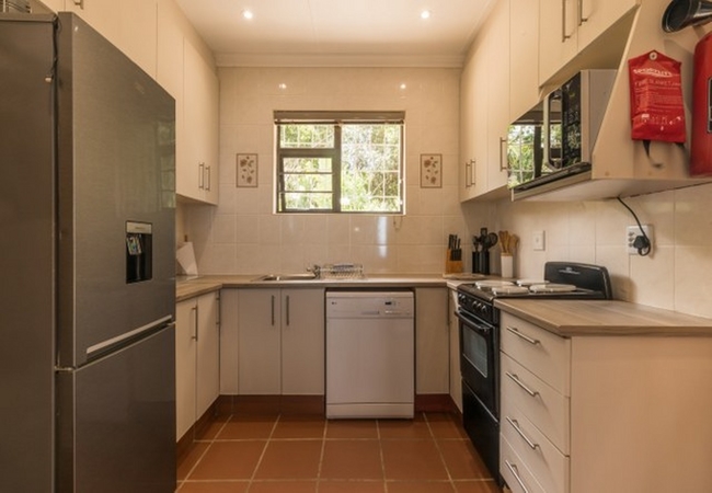 The kitchen is fully equipped for self-catering purposes and includes a gas and electric stove top, electric oven, coffee making machine, kettle, toaster, fridge/freezer, dishwasher and microwave. There is a washing machine outside the kitchen door, undercover. The cottage has an alarm with armed response. Wifi is included.