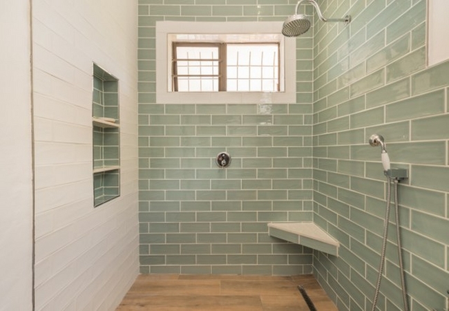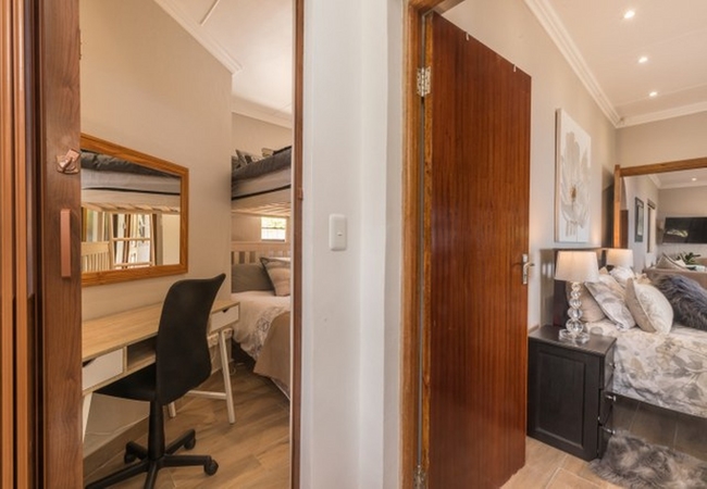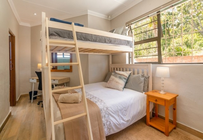 The second bedroom has a tri-bunk bed (double at bottom, single at top) and garden views, plus writing desk. The two rooms share an interleading bathroom with spacious walk-in shower, toilet and hand basin.