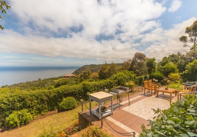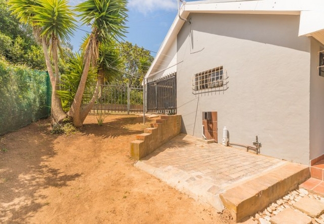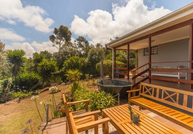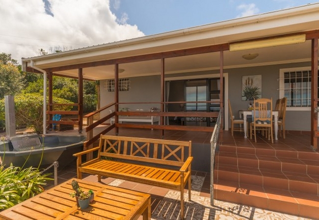 Victoria Bay Holiday Cottage is a freestanding pet-friendly holiday house which sleeps five guests very comfortably. The main bedroom has sea views and is furnished with a Queen-size bed plus dressing table. There is a sliding door leading onto the undercover balcony. The second bedroom has a tri-bunk bed (double at bottom, single at top) and garden views, plus writing desk. The two rooms share an interleading bathroom with spacious walk-in shower, toilet and hand basin. The lounge is equipped with a comfortable L-shape couch, large wall-mounted flatscreen Smart TV with Dstv app and has a door leading onto the undercover balcony. The indoor dining area is open-plan with the lounge and has a six seater table. On the outdoor, undercover balcony is an additional 5 seater dining table, comfortable couches plus a Kol Kol wood fired hot-tub / splash pool. The garden is spacious and fully enclosed. The balcony leads down to a large sundeck with sunloungers and portable BBQ/Braai. The kitchen is fully equipped for self-catering purposes and includes a gas and electric stove top, electric oven, coffee making machine, kettle, toaster, fridge/freezer, dishwasher and microwave. There is a washing machine outside the kitchen door, undercover. The cottage has an alarm with armed response. Wifi is included.