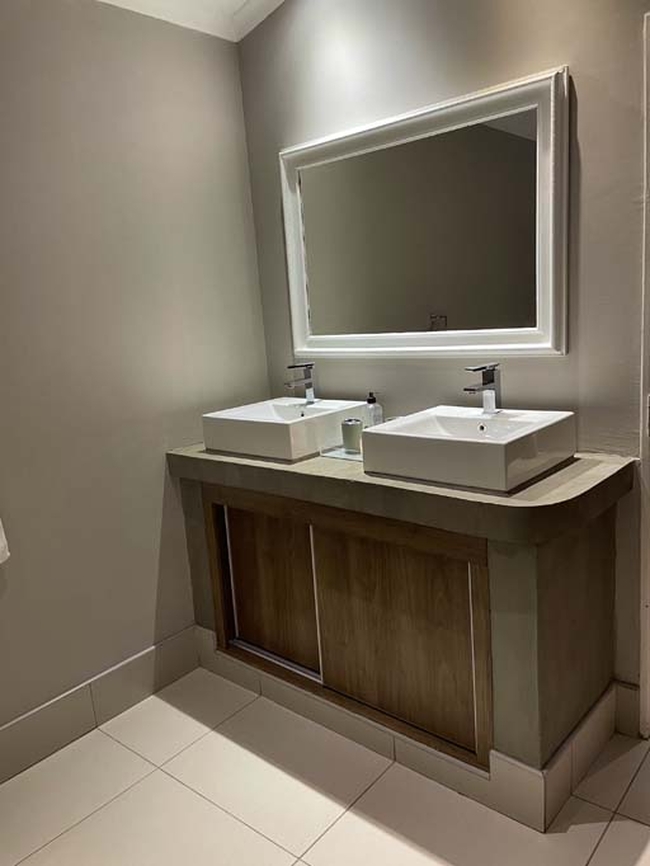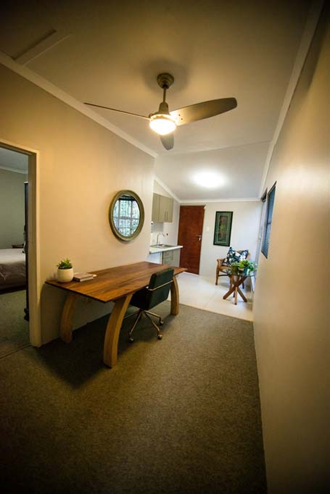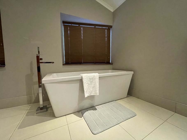 Room 1 is furnished with a Queen-size bed. The en-suite bathroom is fitted with a bath, shower, toilet and basin. The room is equipped with a tea / coffee tray, bar fridge, smart TV with Netflix and DStv. Office space and Wi-Fi is also provided.