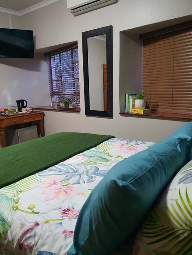 Room 2 is air conditioned and furnished with a Queen-size bed. The en-suite bathroom is fitted with a shower, toilet and basin. It is a sunny room in the winter and cool in the summer. There is a tea / coffee tray, smart TV with Netflix, Showmax and DStv Now. Wi-Fi is also provided.