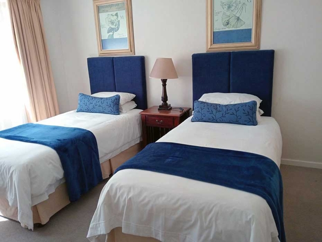 Clarens Golf Villa 174 accommodates up to four guests across two double bedrooms, each featuring a private en-suite bathroom. The villa is arranged on split levels to enhance privacy, with the main bedroom on the upper floor offering a double bed and the lower-level bedroom fitted with twin beds. Both rooms include generous storage space and hairdryers for convenience.