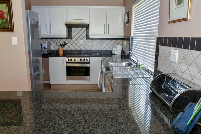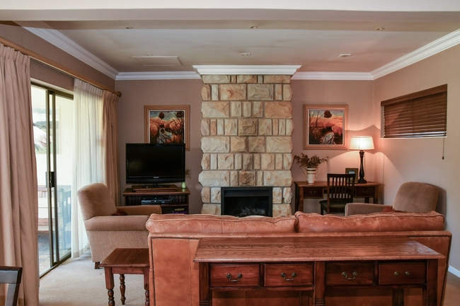 The inviting lounge is equipped with cozy seating, a gas fireplace, and DStv, creating a relaxing atmosphere. For added convenience, the kitchen is fully equipped for self-catering, making it an ideal retreat for a comfortable and independent stay.
