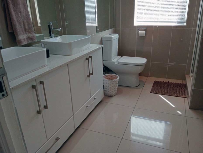 Situated in a quiet cul-de-sac at the top of the Golf Estate, this four-bedroom villa offers privacy and ample parking, making it ideal for entertaining. The spacious living area features a TV with DSTV and opens through glass sliding doors to a covered balcony overlooking the mountains. The dining area, with a large table, flows seamlessly into a well-equipped kitchen with granite countertops and a washing machine. Each of the four double-size bedrooms includes a full en-suite bathroom and is positioned on either side of the living space for maximum privacy. High-speed Wi-Fi is provided throughout the villa. The villa is thoughtfully appointed with a dedicated workspace, a dining table, DSTV and streaming services, an electric blanket, a fireplace, hypoallergenic pillows, a comfortable sitting area, and a non-smoking environment. Guests can enjoy mountain views from the balcony and make use of the hairdryer, iron, ironing board, separate tub and shower, washing machine, microwave, oven, refrigerator, braai facilities, and outdoor patio.