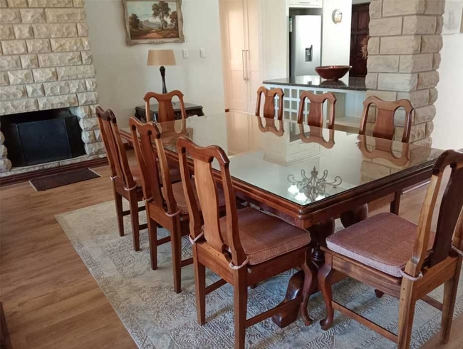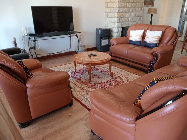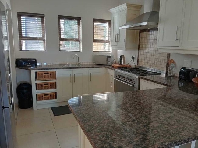 Three of the bedrooms are generously sized doubles, and their placement within the villa allows for maximum seclusion. Each bedroom is tastefully furnished, with attention to comfort and style. A sunroom includes a single bed, and the villa also has two full bathrooms, ensuring convenience and privacy for all guests. Sliding glass doors from the living area open onto a spacious undercover patio with a built-in braai, offering the perfect setting for year-round outdoor dining and entertaining while enjoying the surrounding landscape. The open-plan living and dining area features a wood-burning fireplace, creating a warm atmosphere for colder evenings, while the fully equipped kitchen with a gas stove provides everything needed for self-catering. Additional amenities include DSTV, high-speed Wi-Fi, and access to the estate’s 24-hour security and restricted entry, providing both entertainment and peace of mind throughout your stay.